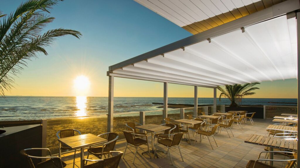 Pueden tener techos de lamas orientables (bioclimáticas), lona tensada retráctil o techo fijo. Muchas incluyen sistemas de iluminación LED, calefactores, altavoces o cortinas laterales enrollables.