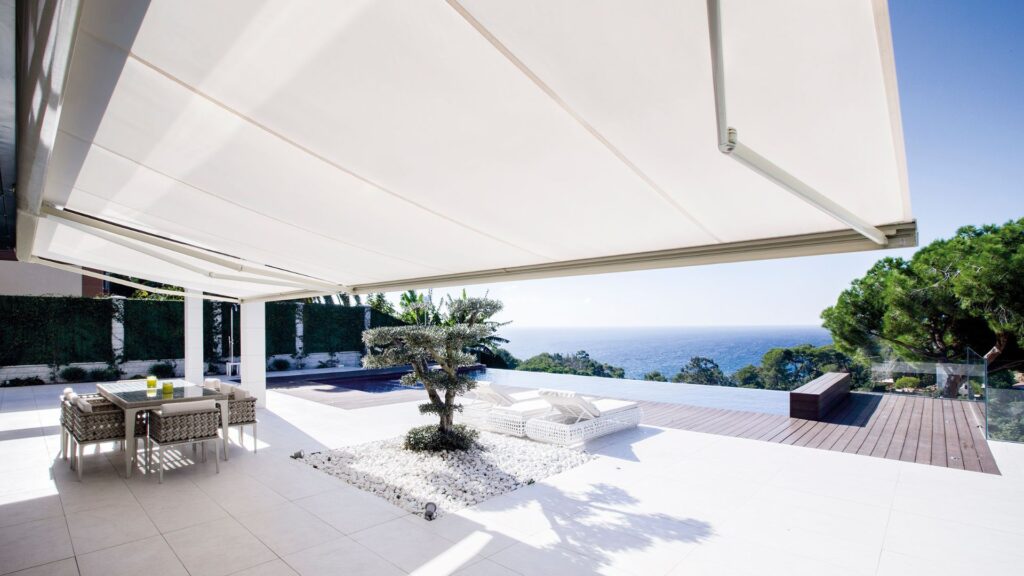 - Pérgola de lona retráctil: sistema de lona extensible sobre guías.