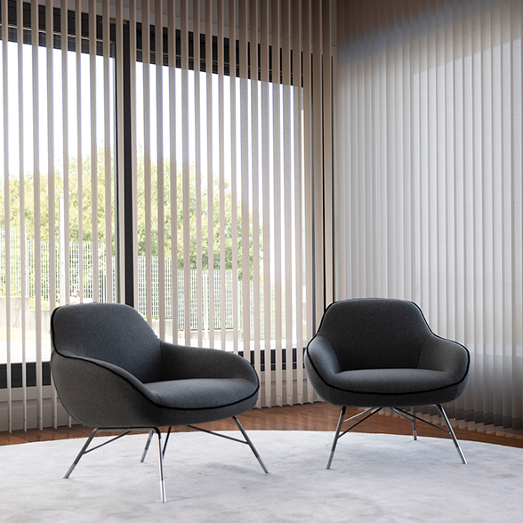 Las cortinas verticales están compuestas por lamas dispuestas en posición vertical que pueden girar sobre su eje y desplazarse lateralmente. Este sistema permite regular con gran precisión la entrada de luz y la privacidad, adaptándose a las necesidades de cada momento del día.